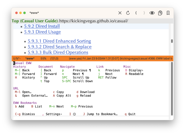 I confess to taking a perverse delight in browsing the web from within Emacs. The EWW package that comes with the standard distribution of Emacs makes this possible. On paper, Emacs really has no business trying to support web browsing with its laughably threadbare support for layout and typography, much less its lack of support for multi-threaded operation. In practice though, I’ve found browsing the web from Emacs to be surprisingly useful. To enhance my usage of EWW, I wanted easy discovery of its features via Transient menus. With that motivation, I set out to build Casual EWW, now available on MELPA in the Casual v2.13.0 update.